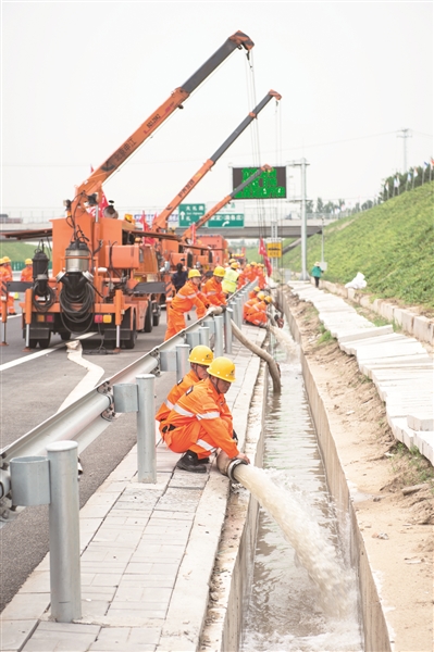 为了第一时间掌握现场情况,无人飞机进行空中巡查,及时将险情路段的情况反馈给指挥车,给指示人员提供现场的情况。在抢险作业方面,除了大型的清障设备外,公司配备3台大型移动排水站,迅速展开排水作业。另外,该路段配备了北京最大的泵站,每小时的排水能力预计达到2.4万立方米。