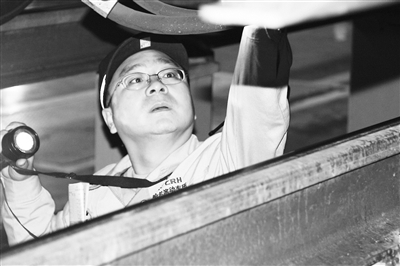 每走一处,他都是认认真真地检查车辆零部件。转向架构架、车轮、空气弹簧及减震装置,每一个零部件微小的故障都会引发列车高速运行的大故障。冷宏军从来不敢怠慢,这是人命关天的大事!目光随手电光走,每钻每跨都是多年养成的习惯。一点一滴,丝毫不差。