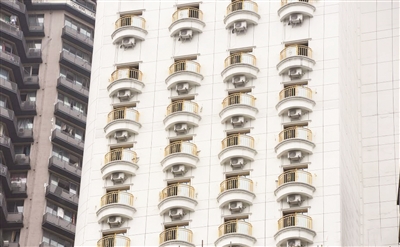 8月13日,重庆市渝中区洪崖洞旁一酒店,所有客房阳台统一安装空调后,远看外墙如有百双“眼睛”。