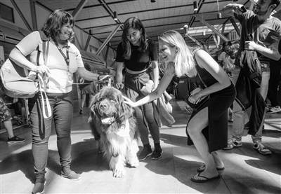 8月23日,温哥华国际机场推出新的宠物狗减压计划,通过引入受过训练的宠物狗到候机大厅供旅客亲近,缓解旅客因旅途导致的焦虑和紧张情绪。图为在加拿大温哥华国际机场,旅客抚摸一只宠物狗。 新华社发