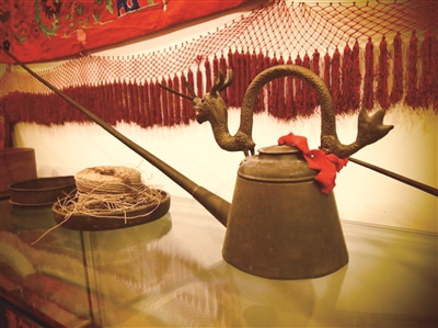 见到“梯形”的“红布棉套”时,记者觉得很有趣,但是很难想象它们以前是做什么用的,其中一个上面,还绣着一龙一凤,而且是凤在上龙在下。“这很明显就是慈禧太后时期的,这个‘红布棉套’叫壶套。”工作人员说。