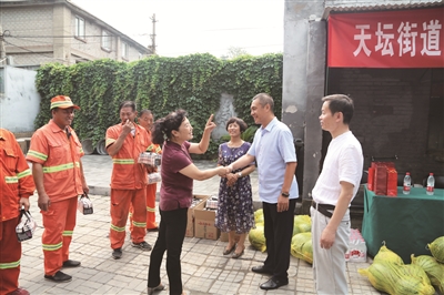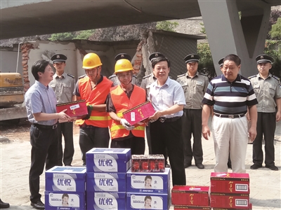 7月13 日,区委副书记宋铁健带领区总工会、团区委、区妇联负责同志到望坛棚户区改造项目指挥部慰问一线职工。区总工会积极谋划,组成了由工会副主席带队的5个“送清凉”小组,兵分五路,分赴区级重点工程“东城区旧城保护定向安置房项目”豆各庄工地建设一线、“百街千巷”环境整治一线,环卫工人、交通警察、消防官兵、医护人员、公安警察、机关服务中心后勤人员、地税人员、城管队员、地铁职员等工作现场,看望慰问了广大职工,为他们送去了清凉物资和慰问金,同时送上的还有工会组织的关爱与祝福。共慰问干部职工近3000人。