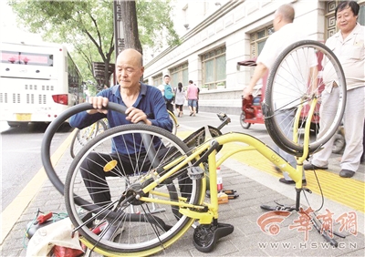 六旬老人王建民家住西安市城西和平春天小区,原来是斗门街办沣滨村村民。种了一辈子庄稼的王建民赶上了拆迁,如今住进了楼房,生活质量提高了不少,亲友还给他介绍了一份在公园干保洁的工作,每月工资2000多元。可才干了几个月,他就辞职了。家人还以为他找到了更好的工作,没想到他是上街义务修共享单车去了。王建民说,看到满街的共享单车被人为破坏,扔在路边还影响市容,感觉非常可惜。