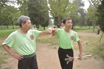 每到周末,天坛公园总会有这么一群人,穿着宽松的练功服,手持刀、叉等兵器,在旁人不时的围观中,耍出几套精彩绝伦的把式,亮出几手炉火纯青的绝活儿。