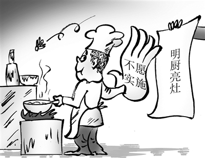 记者近日了解到,国家食品药品监督管理总局拟研究出台明厨亮灶工作指导意见,进一步加强对各地食品药品监管部门相关工作的指导。据了解,2014年,国家食品药品监督管理总局已部署开展明厨亮灶工作,截至去年底,全国已实施明厨亮灶的餐饮服务单位占持证总数的27.52%,但多数餐饮企业却不愿意实施明厨亮灶。(9月8日《北京晨报》)□蒋燕南