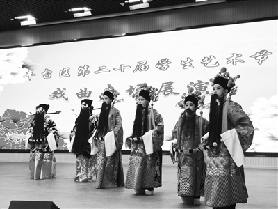 在实际推广中,不少学校也结合各种方式让戏曲走进校园、走近学生。比如,侯乐芃所在的丰台一小引入京剧已经近10个年头。学校不仅开设了京剧普及课,还成立了京剧社团。2014年,学校聘请了中古戏曲学院、中国戏曲学院附中,北京京剧院等8位专业教师和一位专业琴师,开设了青衣、花旦、老旦、武旦、老生、武生、文丑和花脸8个行当的专业课,150多名学生进行了专业的学习。社团连续三年参加“国戏杯”全国青少年戏曲大赛。均荣获集体一等奖的成绩。2016年12月,学校还被评为丰台区戏曲教育示范校。