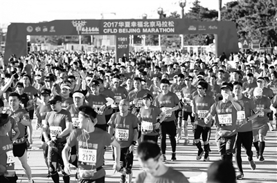 本报讯 9月17日, 2017华夏幸福北京马拉松赛鸣枪开跑。作为国内历史最悠久、影响力最大的马拉松赛事,本届北马吸引了来自33个国家和地区的3万名参赛者同场竞技。