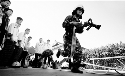 昨天,来自东华门地区企业的50余名职工走进故宫消防中队接受培训,这是故宫消防学校的第100期培训活动。培训中,消防官兵向学员讲解了火灾的危害和逃生技巧。故宫市民消防学校由东华门街道与故宫消防中队联合建立,截至目前已有5000余人接受了消防知识培训。本报记者 于佳 摄影报道