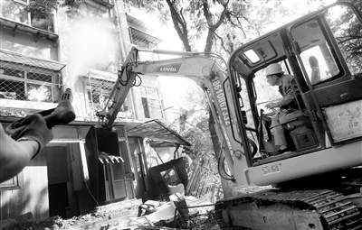本报讯(记者 边磊) 昨天,东城区天坛街道联合城管、公安、工商、食药等部门,出动工作人员40余名,对天坛东里北区12号楼一层违建进行了整体拆除。截至目前,该社区范围内已清除违建135处,涉及面积1889.72平方米,封堵开墙打洞127处,共有6栋居民楼一层违建清零,清除比例约占总数的50%。