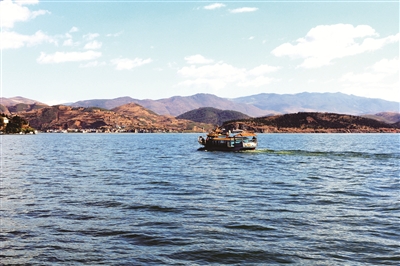 不知是波浪起伏,还是游人骚动,小船儿有些晃悠悠地开动了。开船的是“阿鹏哥”(白族对男子的称呼),一副悠然自得的样子,操着带有当地口音的普通话,跟游客亲热地攀谈着。导游则是“金花”(白族对女子的称呼),虽是羞答答的,但也是风情万种。她们的肤色较黑,戴着一顶草帽,与一身漂亮的白族服饰混搭在一起显得很不协调。这也难怪,她们终日要在高原的烈日下工作,不搞点特殊保护那肯定是受不了的。洱海这个名字初听起来怪怪的,说是远处看像一只耳朵,因此叫做洱海。在船上,我却没能看出“耳朵”的影子,倒是那蓝得有几分夸张的湖面,醉了我的心魂。虽说不上一望无际,却是一碧万顷,如鳞的波纹在阳光下跳跃着,似吹皱了的蓝绸,又像是散落的满天星光。湖面上,船只忙碌地往来着,有能乘坐几百人的大船,也有一个人划动的小舟,而最吸引人的是鱼鹰表演。鱼鹰又称鸬鹚,渔民们把它驯化后,成了专门的捕鱼工具。为了鼓励鱼鹰下水抓鱼,渔民先是给它们抛上一只小鱼作为鼓励,然后把它们赶下水。它们借助着敏锐的双目和锋利的爪子很快就抓到了活蹦乱跳的鱼儿,这立时引来了游客的欢呼声、鼓掌声和相机的快门声。为了表彰“功臣”,渔民就赐给它一条小鱼作为奖赏。看到这,我不由得感叹,人类真不愧是高级动物,如果给人解释“剥削”二字,这应当是最浅显易懂的实例了。