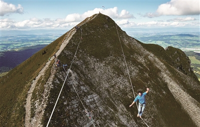 近日,在瑞士弗里堡举办了一场高空走扁带极限活动。来自全球各地的25名高手聚集在2000米高的莫莱松山,表演惊险走绳,为避免跌落风险,参加者都戴有救命索保护。