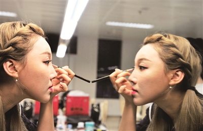 在开演前两个小时,记者来到剧场进行探访。在化妆间里,演员们都在进行服装、定妆等最后的准备工作。在剧中饰演男主人公妻子黄娜的女演员崔琬正在对着镜子一丝不苟的化妆。