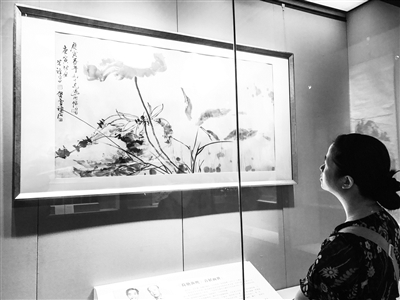 展览现场,首次与广大观众见面的《荷塘渔鹰》,是由齐白石、李苦禅、许麟庐师生三人于1950年共同创作完成,这幅作品疏朗大气,颇有秋风徐来,水波不兴,渔鹰闲勉,荷气清香的意境,尤其是对荷叶,荷杆的用笔用墨,潇洒爽洁,大有似动非动的瞬间感觉。此次画作的首次展出,也是对齐白石老人逝世60周年的纪念。