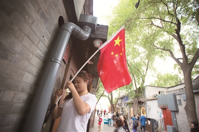 国庆、中秋双节将至,五星红旗扮靓着京城的大街小巷,节日气氛更加浓厚。图为南锣鼓巷商铺的店员正在自家店铺门前挂国旗。