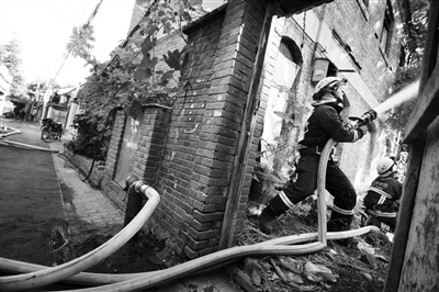 昨天上午,一辆消防车在前门草厂头条狭窄的胡同口停下来,只见消防员迅速将消防水带固定在胡同中新安装的红色消防水泵接合器上,三下两下的工夫,10米高的水柱已经冲天,直接打在了胡同院落中足有三层楼高的粗壮树木上。