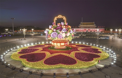“祝福祖国”花果篮的篮内摆放着柿子、石榴、苹果以及牡丹、玉兰、月季等仿真花果,寓意十八大以来我国在各领域取得的辉煌成果。党的十八大以来的5年,是党和国家发展进程中很不平凡的5年。5年来,以习近平同志为核心的党中央团结带领全党全国各族人民万众一心,砥砺奋进,在实现中华民族伟大复兴中国梦的新长征路上,夺取了新的伟大胜利。我相信,每一位来到天安门广场赏花的人,都会感受到作为中国人的无比自豪和骄傲,都会感到自己身上肩负的责任。□许庆惠(媒体人)