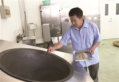 左手在锅上方稍作停留试温,再倒入中药王不留行,于葆墀拿起炊帚画圈般地翻炒起来,没一会工夫就炒制完成。他一边把炒制好的中药快速扫入托盘内,一边对工作室的徒弟说:“王不留行颗粒较小,要用炊帚而不是炒铲来炒制,你们看,这样做好的成品才完全符合标准。”