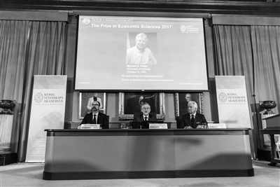 10月9日,在瑞典斯德哥尔摩,瑞典皇家科学院常任秘书戈兰·汉松(中)出席公布诺贝尔经济学奖获奖者的新闻发布会。美国经济学家理查德·塞勒获得2017年诺贝尔经济学奖。