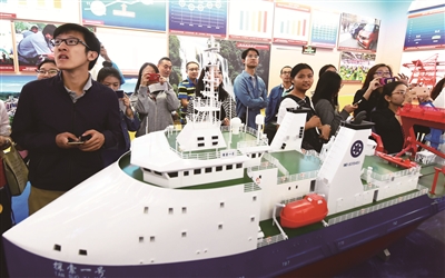 这次成就展既反映了脚踏实地的身边事,也展现了高瞻远瞩的大战略。展览中,精彩纷呈的科技成果模型颇为吸引眼球。“蛟龙”号、中国“天眼”、“复兴号”等众多制作逼真的模型纷纷亮相,国防和军队建设展区推出的巨大沙盘,点燃了参观者的激情。沙盘上整齐地排列着我国的各种尖端武器装备,远程多管火箭炮武器系统、鹰击—62A岸舰导弹发射车、各型潜艇、驱逐舰、航空母舰“辽宁舰”……“海陆空”全方位立体呈现。