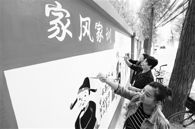 “两学一做”学习园地、古诗词毛笔书法、家风家训漫画……近日,丰台区南苑街道机场社区多了一道风景线,百米手绘文化墙“出炉”,作品涵盖廉洁廉政、核心价值观、中国梦、低碳环保、文明礼仪等内容。30余位社区“草根画家”中既有社区居民、部队战士,也有在职职工、中小学生,大家用自己的方式共同参与社区建设。通讯员 史莉 摄影报道