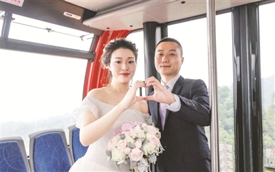 10月10日,出嫁的江西庐山姑娘蔡添把亚洲和中国兴建的第一条3S索道——庐山交通索道当作了自己的“婚车”,和新郎乘坐起穿梭在庐山云海里的“空中婚车”下山结婚。当天,庐山出现气势磅礴的云海景观。庐山交通索道穿梭在云海里,成了庐山姑娘蔡添的“空中婚车”,新郎仿佛是脚踏七色祥云来娶她,场景温馨浪漫。