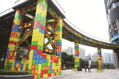 点评:颜色鲜艳的“积木天桥”给钢筋水泥的城市增添了几分童趣。