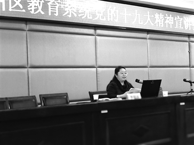 10月27日,通州区委教工委、区教委召开首场学习十九大精神专题报告会,十九大代表、通州区培智学校教师李银环向140余名通州教育系统各级代表传达十九大精神。