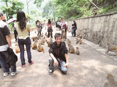 直到走进位于市中心西北部的黔灵山公园时,才发现朋友说的话是一点不假,那里生活着几千只猴子,简直就是一个猴子王国。他们一点也不像野生的,根本就不怕人,随时随地都会出现在你眼前,甚至悄无声息地从你背后现身,在不知不觉中抢走你手里的食物,在你还来不及转身时,它们便已逃到了几十米外,享受它的美餐去了。