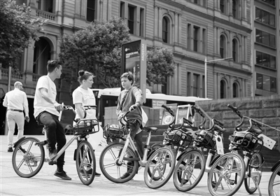 11月14日,在澳大利亚悉尼,人们试用摩拜单车。 中国共享单车公司摩拜14日在澳大利亚悉尼宣布,摩拜单车正式落户悉尼。