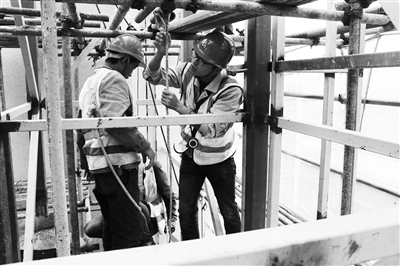 瞿康伟虽然清瘦,但干起工作来认真较劲,一大清早就拉着同事们去工地开展安全检查:现场临电、地下室照明安装是否符合规范以及登高作业安全带是否正确佩戴、各楼层移动架安全防护措施是否到位等。