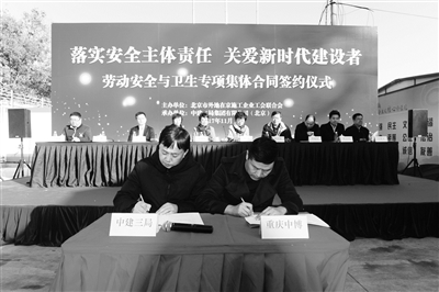 本报讯(记者 马超)中建三局北京公司在中直机关项目举行“落实安全主体责任 关爱新时代建设者”暨劳动安全与卫生专项集体合同签约仪式,该合同为北京市建筑行业第一份,这是记者昨天从中建三局北京公司了解到的。