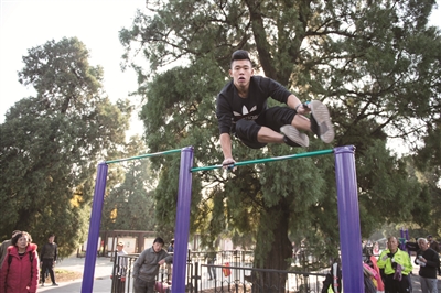 现在一个单杠王洋能练出一百多个动作。“像我练的跟这些大爷们的还不太一样,他们一般有防护措施,而我做的都是徒手动作,一点保护措施都没有,所以有一些风险性。”王洋说,“这些动作特别练爆发力,看起来很酷。”
