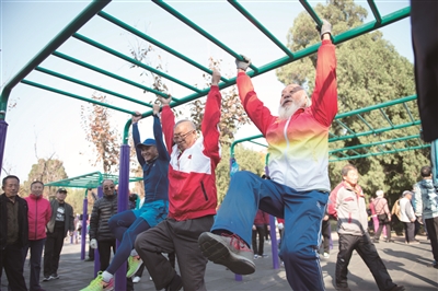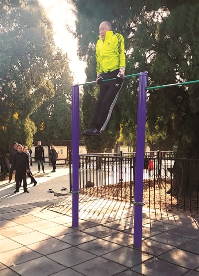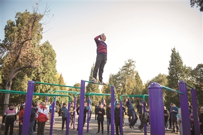 11月4日的早晨阳光明媚,天坛公园里的游人渐渐多了起来。从天坛公园东门进入后,没走多久记者就被传来的一阵阵喝彩声吸引住了。原来,在天坛公园的健身区,一群北京杠爷正在这里进行精彩表演。脚回环、手回环、腹回环、肘回环……一根不会动的单杠,被这群杠爷“收”的服服帖帖,玩出了各种花样。谢顺才就是其中的一位“玩家”。