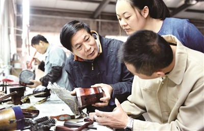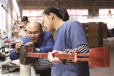 11月9日刘正辉从北京来到江苏泰兴琴艺乐器有限公司,为人造仿生蛇皮产品制作进行实际指导。“刘老师来了!刘老师来了!”职工们立刻围了上来,几句寒暄过后,大家开始就仿生蛇皮在乐器制作中的技术技巧问这问那。