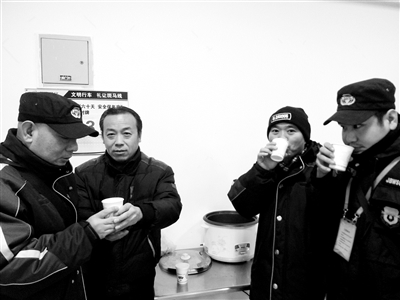 冬运期间,公交客四分公司第10车队每天早上为一线职工提供小米粥、豆浆等早餐和热饮。图为车队工会主席李小龙(左二)早晨为一线司乘人员服务,受到职工的赞扬。本报记者 崔欣 摄影报道