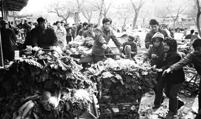 再说说这大白菜,当年的市场供应远不如现在丰富,您就是有钱都难买到不属于当季的瓜果蔬菜。白菜由于产量大价格便宜而且能抗寒可以在室外存放,就成了当时家家户户冬天的当家菜。为了确保一家人冬天能吃到蔬菜,临入冬大街小巷抢购冬储大白菜就成了京城一景儿,有用三轮车拉的,有用自行车后座搭块板子驮的,最常见的是用当年小孩儿坐的四轮竹推车装的,反正只要是能运输的工具全部用上,全家出动囤白菜。这白菜也分三六九等,一级菜最好,三级菜最次,您可甭想着多花钱只买一级菜,人家菜站要求必须搭配着买,菜站工作人员身穿蓝布大褂、戴着白布帽子、套袖、白线手套,一个人抛另一个人接住把白菜码放在搭着木板的老式机械秤上称重,称之前不用您动手,因为怕买主儿把菜帮儿揪掉,称完后就需要您自个儿把白菜搬走了。