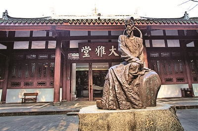 杜甫草堂檐廊结构布局紧凑,位于诗史堂中的铜色杜甫像,恢弘古朴,工部祠堂内供奉有杜甫的泥塑像,栩栩如生,让人顿生敬慕之情。草堂内,小桥、流水、梅园、竹林交错庭中,另有春之梅、夏之荷、秋之菊、冬之兰可赏。