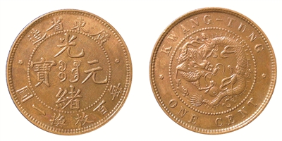此钱每枚重二钱(7.45克),以紫铜95%、白铅4%、锡1% 配合铸成。直径28毫米,形式精美。正面中央铸“光绪元宝”四个汉字及满文“宝广”,外环珠圈,上缘纪地“广东省造”字样,下缘为纪值文字“每百枚换一圆”,左右边饰小花星;背面中央铸有象征清朝皇帝的飞龙图案,龙图外环珠圈,上缘为英文纪地“KWANG-TUNG”(广东),下缘英文纪值“ONE CENT”(一仙),左右边饰小花星。“仙”(CENT)意为“分”,即一圆银币的百分之一,原是英国在香港发行的铜辅币计值单位,这也正说明了中国铜元受香港铜辅币(香港铜元又叫铜仙,始铸于1863年)影响很深。
