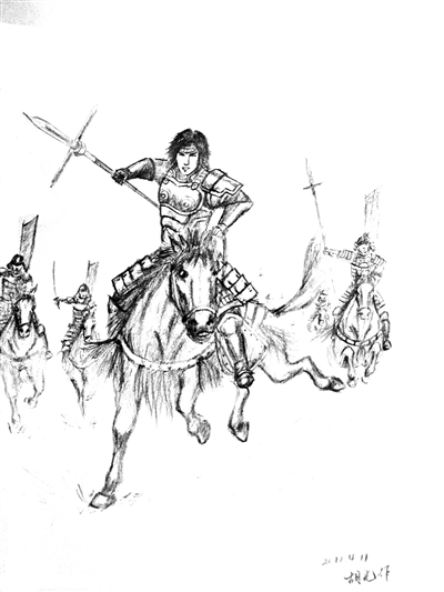 在采访时,胡光随手拿起一支签字笔只用几分钟就画了一头正在奔跑的骏马,随后再画出缰绳、辔头。由于马在奔跑,根根鬃毛随风飘起的感觉甚为生动。然后,胡光只用十几分钟,戴着头盔,穿着铠甲战靴、披风,手拿长矛的骑马武士就在画纸上栩栩如生了。虽然是普通的签字笔,依然能把武士披风迎风鼓起的感觉描绘得惟妙惟肖。“如果用铅笔就能更细腻地描绘,还能更改。”胡光打量着自己的作品,不甚满意地说。