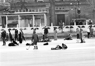 昨天,什刹海湖面上聚集了数十名“胆大”的滑冰爱好者。在冰层很薄的湖面上,一边是滑冰爱好者们玩性正酣,一边还有人在冰面上“摆摊”出租冰鞋,大家各得其乐,把个人的安全抛到脑后。据了解,正规冰场的冰层厚度必须达到15厘米以上,由于今冬天气偏暖,各正规冰场都将推迟开业时间。本报记者 孙妍 摄影报道