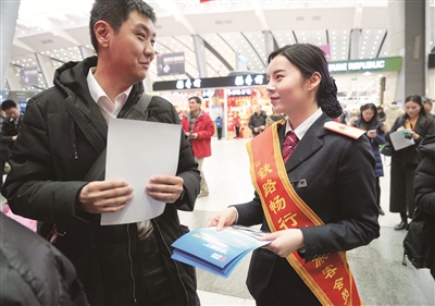 自12月20日起,铁路部门将推出“铁路畅行”常旅客会员服务,以后购买火车票的积分可兑换车票。关于铁路常旅客会员服务详细情况,旅客可以登录铁路客户服务中心12306网站、拨打12306客服电话或到各大车站窗口查阅、咨询。图为北京南站一名工作人员(右)向旅客介绍“铁路畅行”常旅客会员有关情况。 新华社发