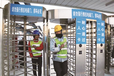 中建二局北京分公司国家知识产权工程项目部近日推出“权益保障卡”,集人事管理、消费、安全、教育等七大模块服务于一体,工友们持卡还可享受就餐、洗浴、购物等服务。工友们说:“在此工作、生活‘一卡’就可解决,身上可以不用带现金了。”本报记者 陈艺 摄影报道