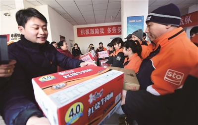 昨天,北京市总工会两节送温暖活动启动。图为北京市服务工会为申通快递凤凰城分公司员工们带来了防雾霾口罩和方便面等慰问品,送来工会的问候。