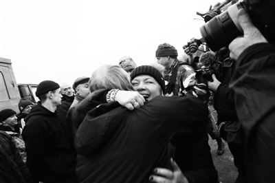 乌克兰政府同乌东部民间武装12月27日进行了自冲突以来最大规模的战俘交换,乌政府用238人换回74人。图为在乌克兰顿涅茨克地区,人们在战俘交换现场拥抱庆祝。新华社发