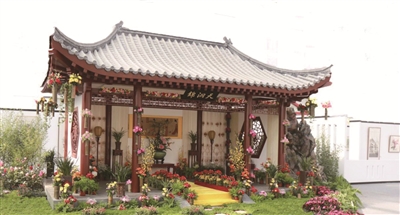 在此时期,中国插花史上最有影响的是“锦洞天”和“占景盘”。“锦洞天”是南唐后主李煜于每年春盛时在宫殿举行的盛大插花展,可谓是中国最早的插花展。宋陶谷《清异录》记载:“李后主每逢春盛时,梁栋窗壁,柱拱阶砌,并做隔筒,密插杂花,榜曰:‘锦洞天’”。根据《清异录》中的描述,作者创作的“锦洞天”(见下图),用具有皇家风格的建筑为背景,用竹筒做容器,密插杂花置于诗中所描绘的各个部位,琳琅满目,再现了当时的盛况。