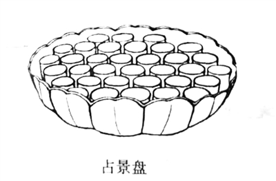 “占景盘”是插花时用来固定花材的工具,它是五代时期由郭江洲发明的,他在盘底铸满若干均匀分布的低矮的铜管,管下口相通,向盘中注水,花材插于管中并可以吸水,占景意为竖立的花草植物,使插花造型更加容易可行。占景盘的发明是中国插花技术的一大进步,它是花插(剑山)的雏形。