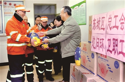 元旦当天,东城区总工会来到区环服中心一所北京站分队,为这里的75名一线环卫职工送上食用油等生活必需品,标志着东城区两节送温暖工作正式启动。今年,区总工会将投入310万元,为辖区困难职工、劳模、一线职工送温暖。劳动关系不在东城,但是为东城服务的职工,也将纳入送温暖范围。