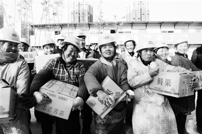 元旦前一天,陕西省咸阳市礼泉县史德镇果农南俊英一大早就驱车来到中建二局北京分公司南长安街壹号项目工地,车上拉着3000公斤香甜可口的苹果。刚到项目部,南俊英跳下车,紧紧握住项目党支部副书记张京涛的手,随后便把一面写有“爱心助农,大爱无疆”的锦旗递了过去。