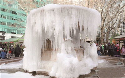 点评:能把不停喷水的喷泉都冻成冰,大自然再次向人类显示了它的力量。