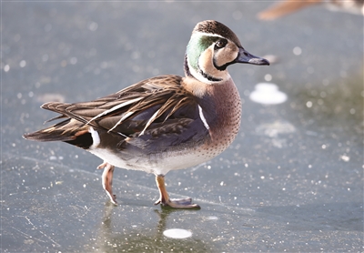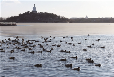 在北京北海公园北门的湖面上,野鸭和鸳鸯们在寒风中潜水嬉戏,其中一对体型偏小的鸭子“混迹”其中,雄鸟脸上花纹很显眼,眼睛到颈部呈现绿色。连日来,这对北京少见的珍稀鸟类——花脸鸭,吸引不少人来观看。花脸鸭2012年被列入《世界自然保护联盟》濒危物种红色名录的低危物种名录,是过境北京的旅鸟,1月份停留北京的花脸鸭十分少见。“北京鸟类有400多种,近年种类更多了。”北京市野生动物救护中心工作人员王伯君说,这得益于北京生态环境改善,公园、湿地增多,以及市民保护环境和鸟类意识提高。